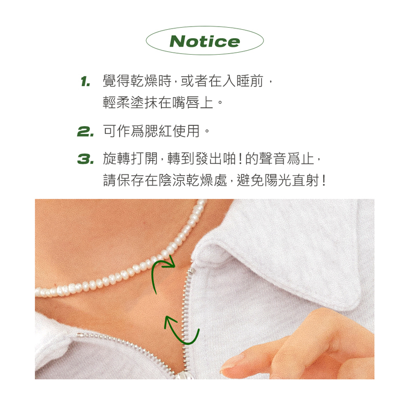 使用方法:在未塗抹底妝的裸唇上表現會最漂亮自然。直接塗抹於雙唇,打造出更加自然的唇色。